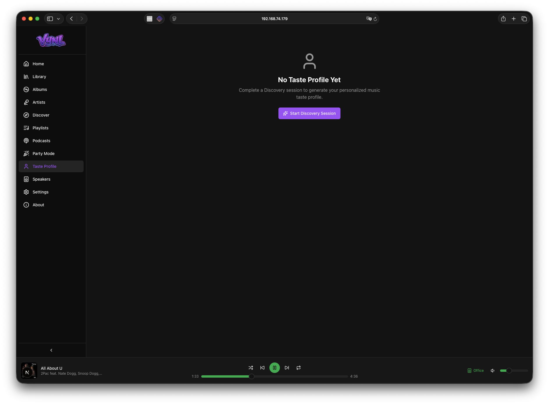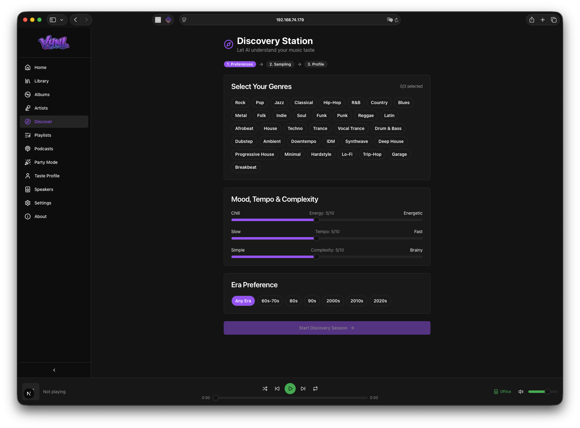 Vynl uses Claude AI to build a deep understanding of your musical taste. Start a discovery session by choosing genres, mood, tempo, and era. Rate sample tracks as bad, ok, or amazing — and Vynl generates a detailed taste profile with genre distribution, top artists, and mood preferences. Use your profile to get 10 personalized recommendations of tracks you don't own yet, or auto-generate playlists from your existing library that match any mood.