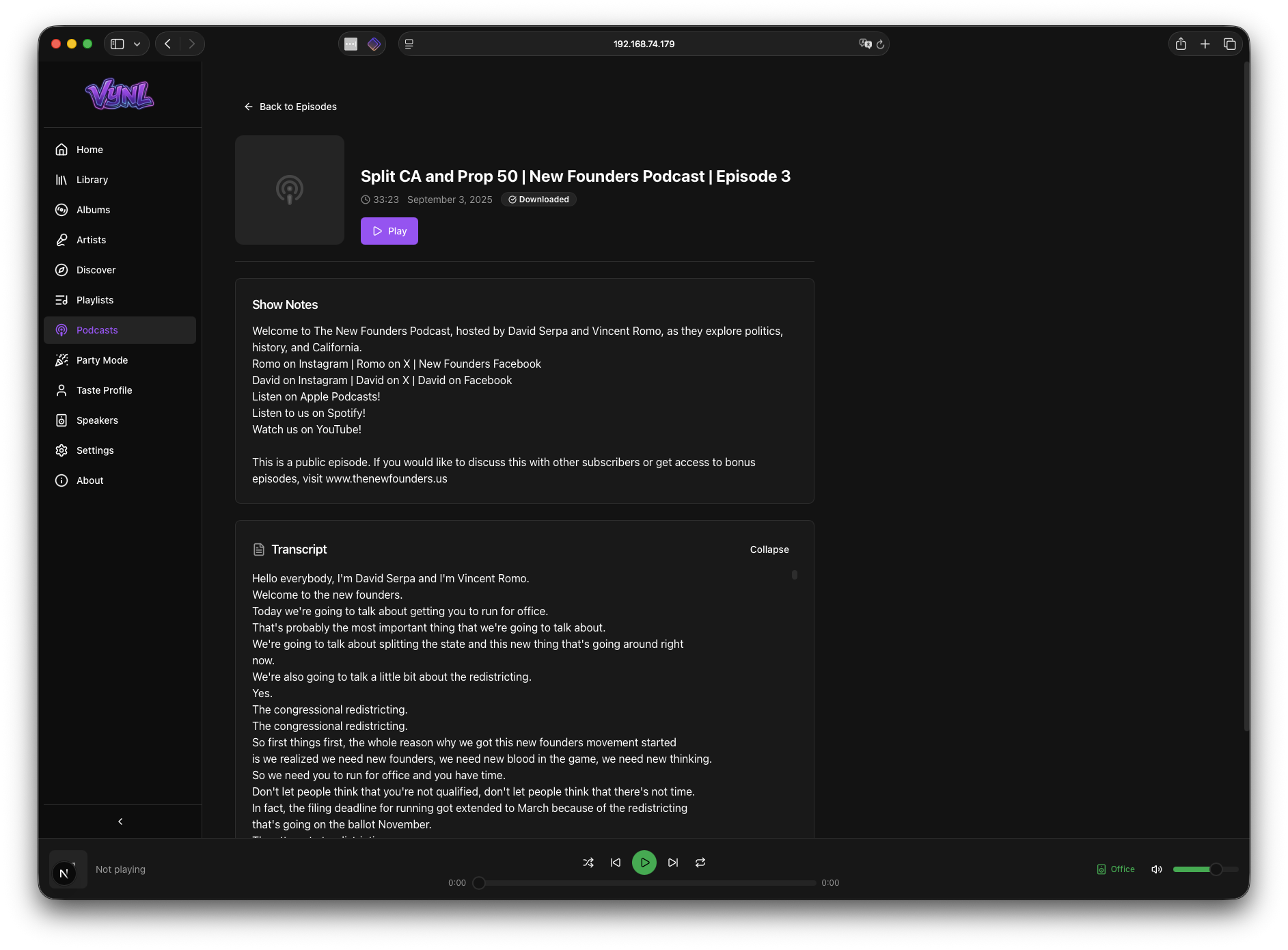 Subscribe to podcasts via RSS feed, browse episodes, download for offline listening, and track your playback position. Built-in Whisper transcription converts episodes to searchable text. Fabric AI generates summaries and extracts key wisdom from each episode.