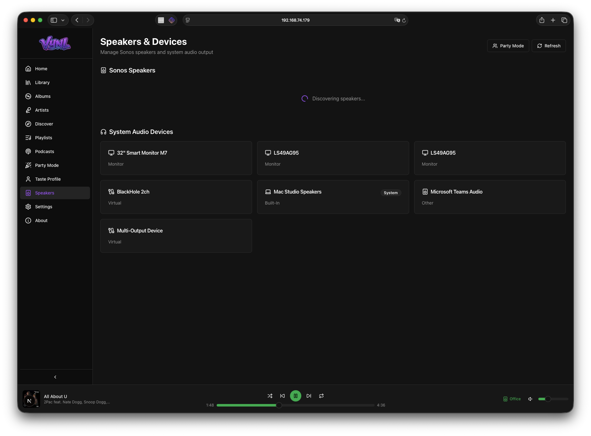 Full Sonos integration with network speaker discovery, playback control, volume management, and room grouping. Play any track from your library to any Sonos speaker with one tap. Group speakers for party mode. Control everything from the Vynl interface — play, pause, skip, adjust volume per room.